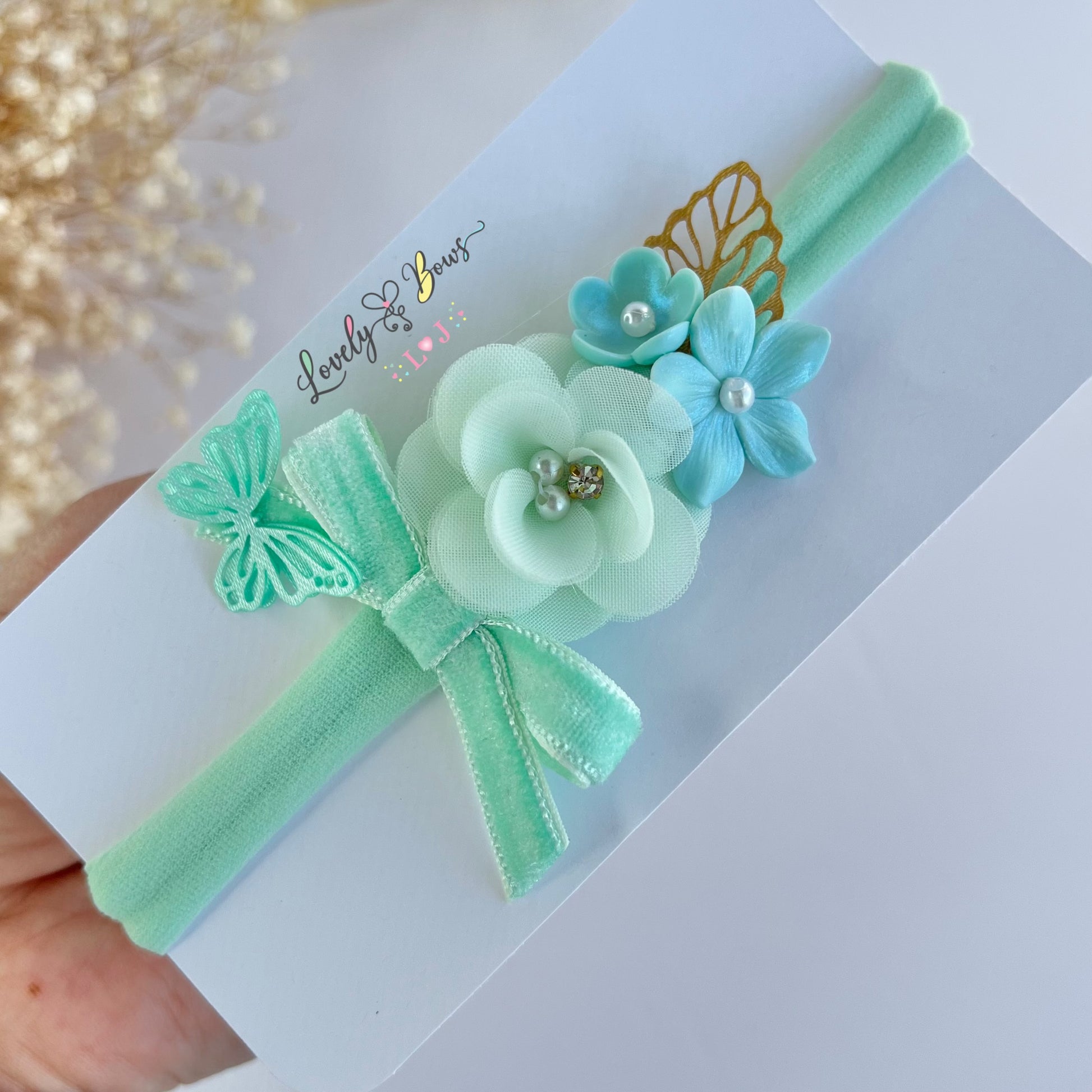 Delicate flower headbands available in 5 colors, fit newborn to 12 months.